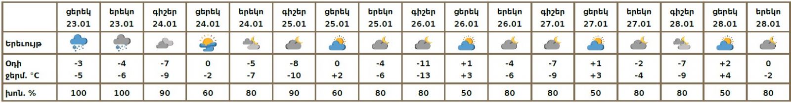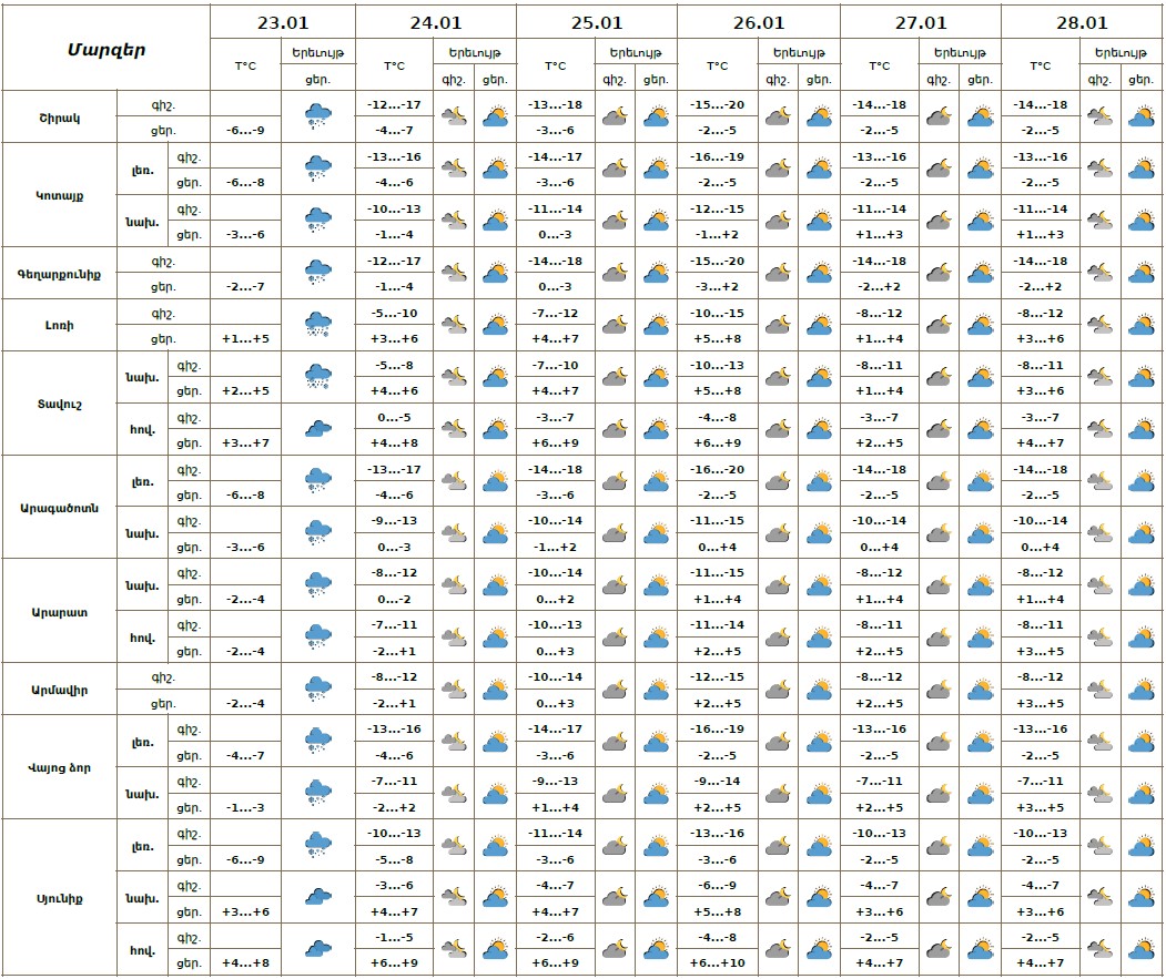 Հունվարի 23-ի ցերեկը սպասվում է ձյուն: Հունվարի 24-28-ին սպասվում է առանց տեղումների եղանակ: