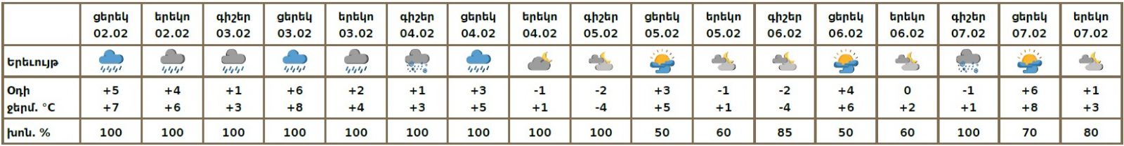 Փետրվարի 2-ի ցերեկը, 3-4-ին, 7-ի գիշերը և առավոտյան ժամերին սպասվում են տեղումներ՝ անձրևի և ձնախառն անձրևի տեսքով։ Փետրվարի 5-6-ին, 7-ի ցերեկը սպասվում է առանց տեղումների եղանակ։ Փետրվարի 3-ի գիշերը և առավոտյան սպասվում է մառախուղ։