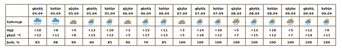 Ապրիլի 4-ի ցերեկը, 7-9-ին ժամանակ առ ժամանակ սպասվում է անձրև։ Ապրիլի 5-ին և 6-ին կեսօրից հետո սպասվում է կարճատև անձրև։