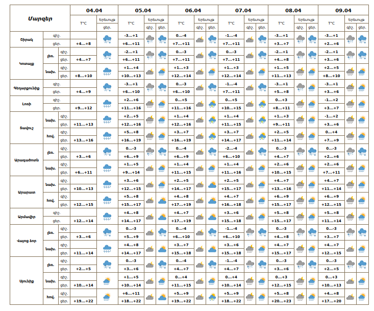 Ապրիլի 4-ի և 7-ի ցերեկը, 8-9-ին ժամանակ առ ժամանակ շրջանների զգալի մասում, ապրիլի 5-ին, 6-ի ցերեկը, 7-ի գիշերն առանձին շրջաններում սպասվում են տեղումներ. լեռնային գոտիներում՝ ձյան և թաց ձյան, նախալեռնային և հովտային գոտիներում՝ անձրևի տեսքով։ Ապրիլի 6-ի գիշերը սպասվում է առանց տեղումների եղանակ։ Քամին` հարավարևմտյան` 2-5 մ/վ, ապրիլի 8-9-ին առանձին շրջաններում սպասվում է քամու ուժգնացում 15-18 մ/վ արագությամբ: Օդի ջերմաստիճանն ապրիլի 4-ի ցերեկը կնվազի 4-6 աստիճանով, ապրիլի 5-6-ին ցերեկային ժամերին աստիճանաբար կբարձրանա 2-4 աստիճանով։