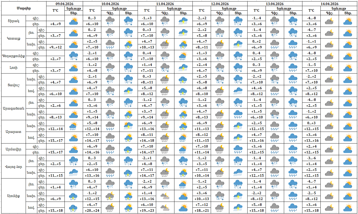 Ապրիլի 9-ի ցերեկն առանձին շրջաններում, 10-13-ին ժամանակ առ ժամանակ շրջանների զգալի մասում սպասվում են տեղումներ, լեռնային և առանձին նախալեռնային գոտիներում ձյան և թաց ձյան, հովտային գոտիներում՝ անձրևի տեսքով։ Առանձին վայրերում սպասվում է ամպրոպ։ Ապրիլի 14-ին սպասվում է առանց տեղումների եղանակ։