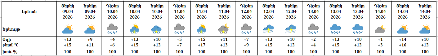 Ապրիլի 9-ի ցերեկը, 14-ին սպասվում է առանց տեղումների եղանակ։ Ապրիլի 10-13-ին ժամանակ առ ժամանակ սպասվում է անձրև, հնարավոր է նաև ամպրոպ։ Ապրիլի 9-ի ցերեկը, 10-ին սպասվում է քամու ուժգնացում 12-15մ/վ արագությամբ։