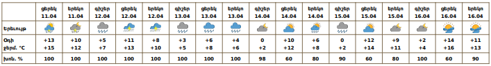Ապրիլի 11-ի ցերեկը, 12-13-ին ժամանակ առ ժամանակ սպասվում է անձրև, հնարավոր է նաև ամպրոպ։ Ապրիլի 14-ին,15-ի գիշերը հնարավոր է կարճատև անձրև։ Ապրիլի 15-ի ցերեկը, 16-ին սպասվում է առանց տեղումների եղանակ։