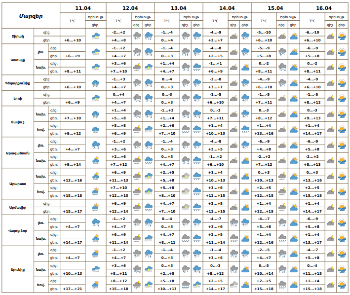 Ապրիլի 11-ի ցերեկը, 12-13-ին ժամանակ առ ժամանակ շրջանների զգալի մասում, 14-ին, 15-ի գիշերն առանձին շրջաններում սպասվում են տեղումներ. առանձին վայրերում՝ առատ։ Տեղումները լեռնային և առանձին նախալեռնային գոտիներում կդիտվեն ձյան և թաց ձյան, հովտային գոտիներում՝ անձրևի տեսքով։ Առանձին վայրերում սպասվում է ամպրոպ։ Ապրիլի 15-ի ցերեկը, 16-ին սպասվում է առանց տեղումների եղանակ։ Քամին` հարավարևմտյան` 2-5 մ/վ, ապրիլի 11-ի ցերեկն առանձին շրջաններում սպասվում է քամու ուժգնացում՝ 18-23մ/վ արագությամբ, լեռնային գոտիներում` բուք, ցածր հորիզոնական տեսանելիություն: Օդի ջերմաստիճանն ապրիլի 13-ի ցերեկը և 14-ի գիշերը կնվազի 5-7 աստիճանով։