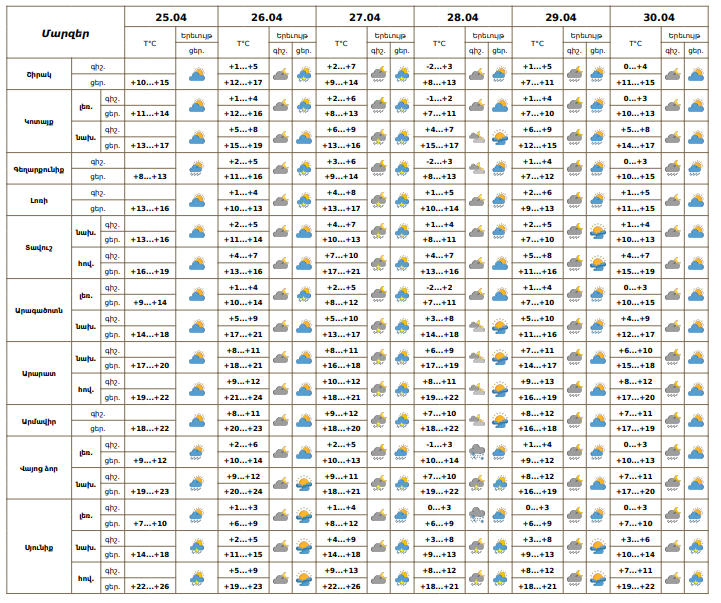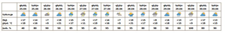 Ապրիլի 25-ի և 26-ի ցերեկը, 27-30-ին առանձին շրջաններում ժամանակ առ ժամանակ սպասվում է անձրև և ամպրոպ, առանձին հատվածներում հնարավոր է նաև կարկուտ: Քամին`հարավարևմտյան`2-5 մ/վ, ամպրոպի ժամանակ սպասվում է նաև քամու ուժգնացում 16-20 մ/վ արագությամբ։ Օդի ջերմաստիճանն էապես չի փոխվի։