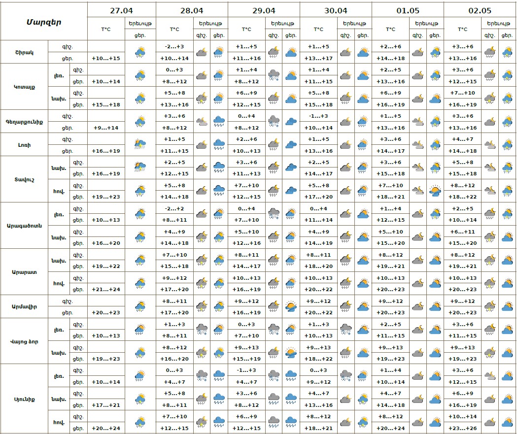 Ապրիլի 27-ի ցերեկը, 28-30-ին և մայիսի1- 2-ին առանձին շրջաններում սպասվում է կարճատև անձրև և ամպրոպ, տեղ-տեղ հնարավոր է կարկուտ: Ապրիլի 27-ի ցերեկն առանձին հատվածներում տեղումները կլինեն ինտենսիվ։ Ապրիլի 28-ի և 29-ի գիշերը լենային շրջաններում տեղումները կլինեն թաց ձյան տեսքով։