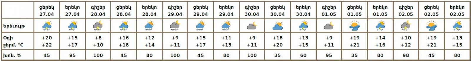 Ապրիլի 27-ին կեսօրից հետո, 28-29-ին, մայիսի 1- 2-ին սպասվում է կարճատև անձրև և ամպրոպ, ամպրոպի ժամանակ սպասվում է նաև քամու ուժգնացում՝ 16-19մ/վ արագությամբ։