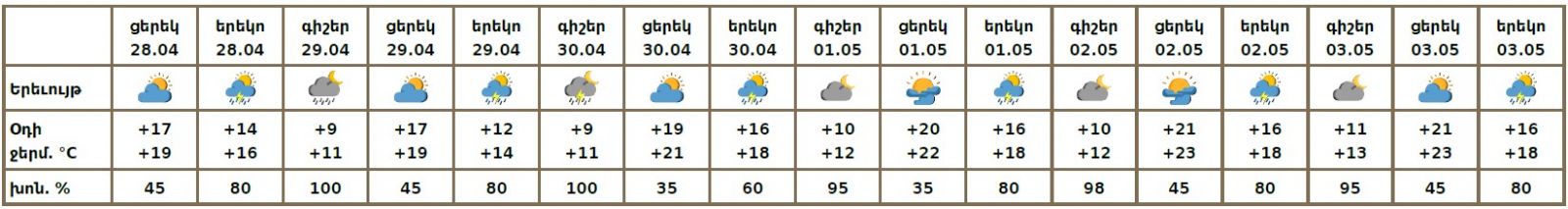 Ապրիլի 28-ի ցերեկը, 29-30-ին, մայիսի 1-3-ին առանձին շրջաններում սպասվում է կարճատև անձրև և ամպրոպ, տեղ-տեղ հնարավոր է կարկուտ: Ապրիլի 29-ի գիշերը լենային շրջաններում տեղումները կլինեն թաց ձյան տեսքով։ Քամին`հարավարևմտյան`2-5 մ/վ, ամպրոպի ժամանակ սպասվում է նաև քամու ուժգնացում 16-20 մ/վ արագությամբ։