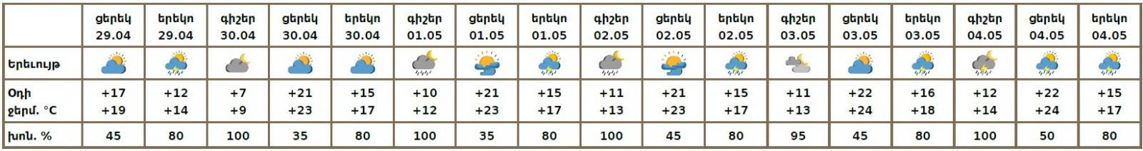 Ապրիլի 29-ին կեսօրից հետո քաղաքի առանձին հատվածներում հնարավոր է կարճատև անձրև և ամպրոպ։ Ապրիլի 30-ին սպասվում է առանց տեղումների եղանակ։ Մայիսի 1-4-ին գիշերը և երեկոյան ժամերին սպասվում է կարճատև անձրև և ամպրոպ, ամպրոպի ժամանակ սպասվում է նաև քամու ուժգնացում՝ 16-19մ/վ արագությամբ։