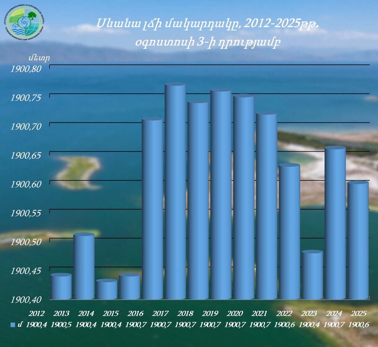 Սևանա լճի մակարդակը 2025 թվականի հուլիսի 28-ից օգոստոսի 3-ն ընկած ժամանակահատվածում իջել է 2 սմ-ով և կազմել՝ 1900.60 մ (03.08.25թ․), որն անցյալ տարվա նույն օրվա մակարդակից ցածր է 6 սմ-ով, իսկ 2025 թվականի հունվարի 1-ի մակարդակից բարձր է 21 սմ-ով։