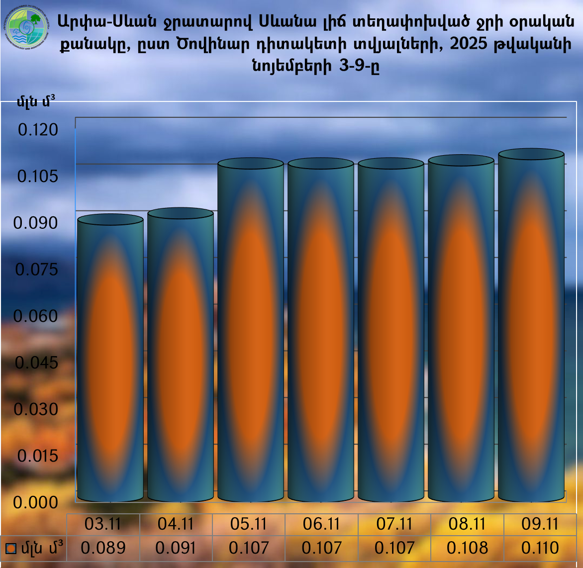 Արփա-Սևան ջրատարով Սևանա լիճ տեղափոխված ջրի քանակը 2025 թվականի նոյեմբերի 3-9-ն ընկած ժամանակահատվածում կազմել է 0.719 մլն.մ3, իսկ 2025 թվականի հունվարի 1-ից նոյեմբերի 9-ը ներառյալ՝ 108.859 մլն.մ3: